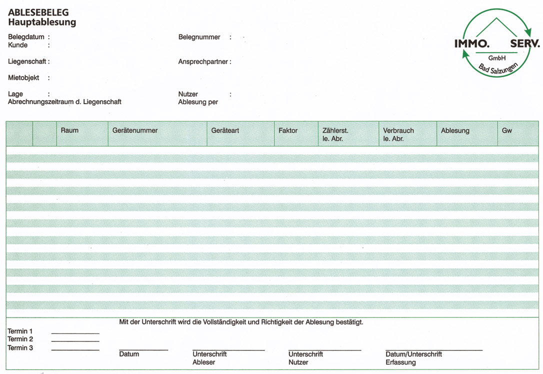 Anfang jeden Jahres werden die in den Liegenschaften befindlichen Messgeräte (Heizkostenverteiler, Wärmezähler, Wasserzähler) durch unsere jahrelang erfahrenen und geschulten Ableser abgelesen. Diese Daten werden auf Ablesebelege notiert und der Mieter erhält sofort einen Durchschlag mit seinen Verbrauchswerten, um diese später mit den in der Abrechnung aufgeschlüsselten Verbrauchsdaten besser und schneller nachvollziehen zu können.